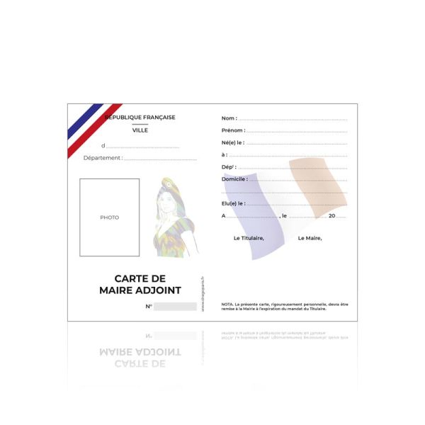 Carte d'élu destiné au Conseiller Municipal en papier carton épais et résistant. Au recto, une impression de type cuir avec un vernis inrayable. Au verso, la carte sur fond blanc à compléter le tout orné de l'hologramme Marianne. La hauteur est de 16 centimètres et la largeur de 12 centimètres.