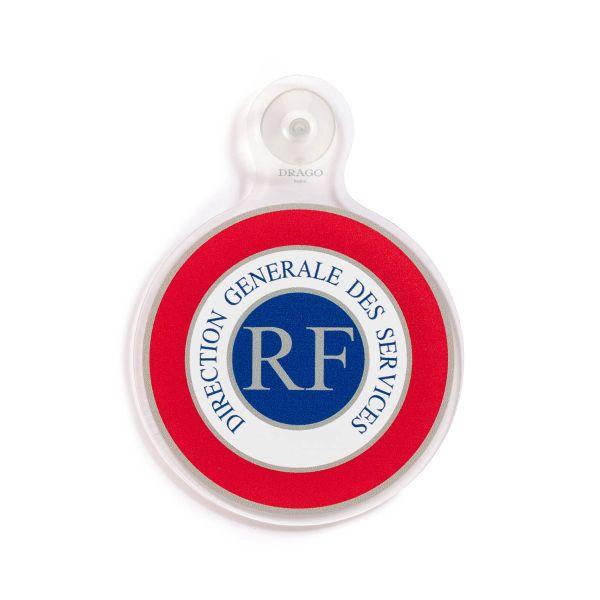 Dotée d'une ventouse, la cocarde en plexiglass est facilement détachable. On retrouve au centre les inscriptions "Maire-Adjoint" ainsi que les initiales RF".