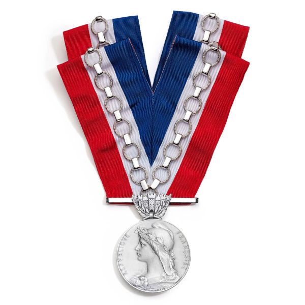Fabriqué en France, ce collier de Maire est suspendu à un ruban cousu main aux couleurs de la République Française. La médaille en bronze dorée représente le profil de Marianne.