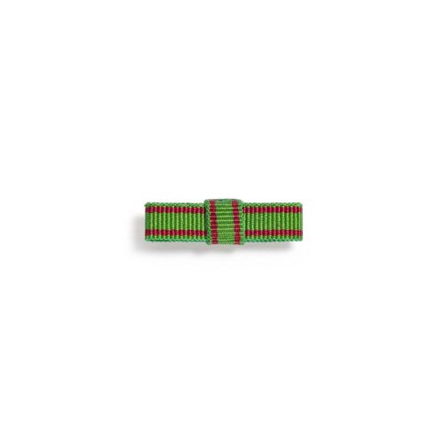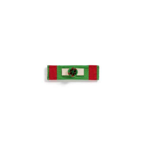 L’insigne est une étoile émaillée blanche à six branches, entourée de feuilles de chêne et de laurier vertes, suspendue à un ruban vert moiré bordé de lisérés rouge orangé.