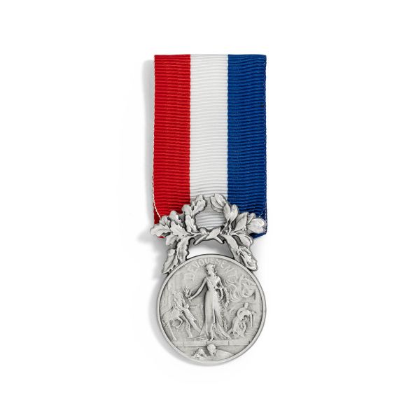 Cette médaille en bronze doré représente une femme debout tenant une couronne dans sa main gauche et une palme dans sa main droite. En arrière plan, trois scènes de sauvetages sont illustrées et accompagnées de l'inscription "Dévouement". Au revers de la médaille, les mots "Ministère de l'Intérieur" sont placés au centre surmontés de l'inscription "République Française" en exergue haut. Le revers de la médaille est également composé d'un cartouche rectangulaire où se grave l'initiale du prénom et le nom de la personne décorée. Une bélière en forme de feuillage de chêne joint la médaille au ruban. Le ruban de couleur bleue, blanc et rouge a une longueur de 60 millimètres et une largeur de 30 millimètres. Le diamètre de la médaille est de 28 millimètres.