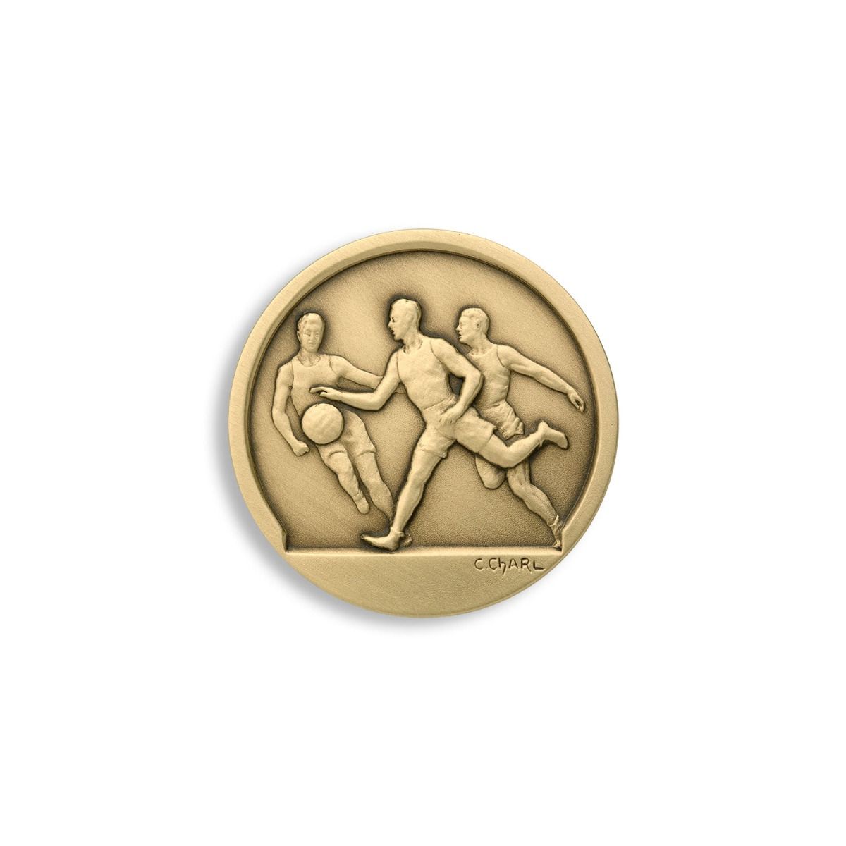 Cette pièce en bronze patiné de 46 mm mettant en avant des basketteurs en plein match ravira les compétiteurs et collectionneurs.