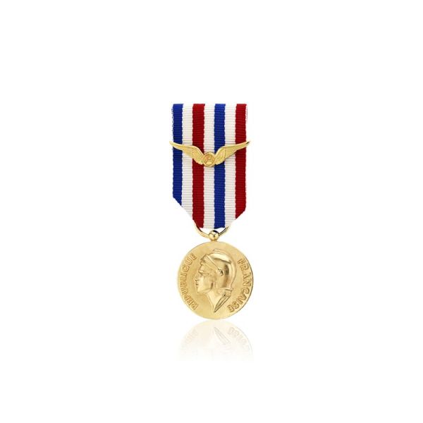 Cette médaille en bronze patiné représente un homme portant un casque entouré de l'inscription "République Française". Au revers de la médaille sont représentées les ailes d'un oiseau encerclées par une couronne de feuilles de laurier et de chêne. Sur les bords de la médaille se trouvent les inscriptions "Ministère de la Défense - Air" en exergue haut et "Honneur-Travail-Dévouement" en exergue bas. Le revers est également composé d'un cartouche rectangulaire où se grave l'initiale du prénom et le nom de la personne décorée. La médaille est retenue par un ruban tricolore constitué d'une agraphe formant deux ailes reliées au centre par la lettre A. Le ruban a une longueur de 55 millimètres et une largeur de 26 millimètres. Le diamètre de la médaille est de 27 millimètres.