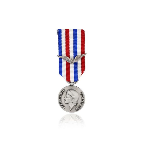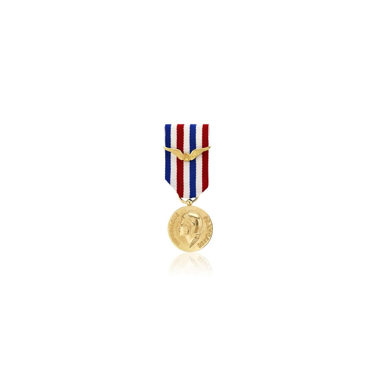 Cette médaille en bronze doré représente un homme portant un casque entouré de l'inscription "République Française". Au revers de la médaille sont représentées les ailes d'un oiseau encerclées par une couronne de feuilles de laurier et de chêne. Sur les bords de la médaille se trouvent les inscriptions "Ministère de la Défense - Air" en exergue haut et "Honneur-Travail-Dévouement" en exergue bas. Le revers est également composé d'un cartouche rectangulaire où se grave l'initiale du prénom et le nom de la personne décorée. La médaille est retenue par un ruban tricolore constitué d'une agraphe formant deux ailes reliées au centre par la lettre A. Le ruban a une longueur de 55 millimètres et une largeur de 26 millimètres. Le diamètre de la médaille est de 27 millimètres.