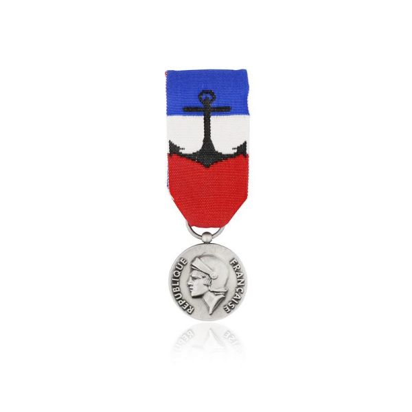 Cette médaille en bronze doré représente un homme portant un casque entouré de l'inscription "République Française". Au revers de la médaille se trouve une illustration composée de deux canons entrecroisés en son centre par la mention "RF" et traversée par une ancre. Ce symbole est accompagné de grappe de raisins et d'épis de blé. Sur les bords de la médaille se trouvent les inscriptions "Ministère de la Défense - Marine" en exergue haut et "Honneur-Travail-Dévouement" en exergue bas. Le revers est également composé d'un cartouche rectangulaire où se grave l'initiale du prénom et le nom de la personne décorée. Le ruban tricolore est constitué au centre d'une ancre noire imprimée. Celui-ci a une longueur de 60 millimètres et une largeur de 28 millimètres. Le diamètre de la médaille est de 28 millimètres.