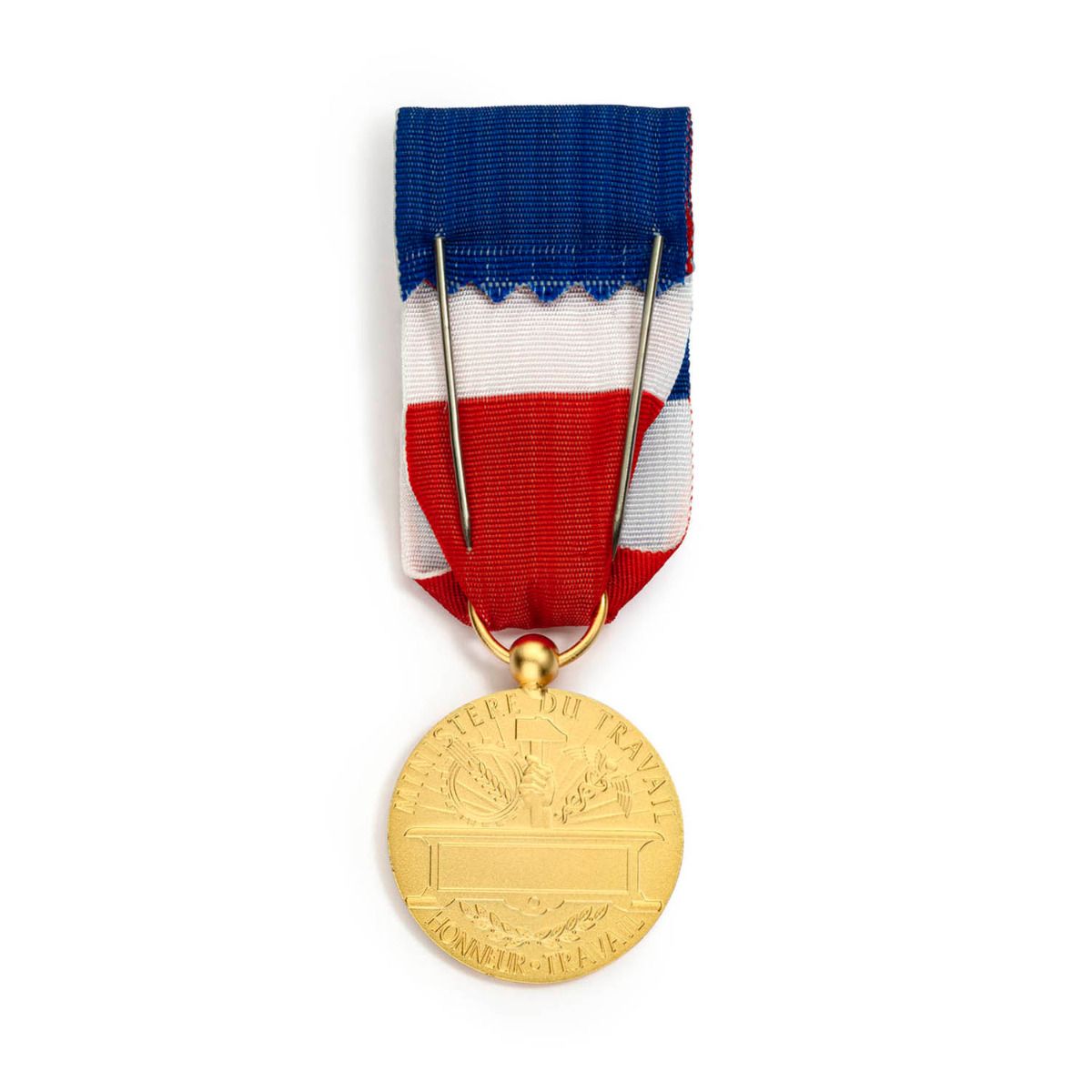 Le revers est encadré par "Ministère du Travail" et "Honneur Travail", mettant en scène un ensemble d'outils. Elle marque l'excellence et le professionnalisme du récipiendaire.