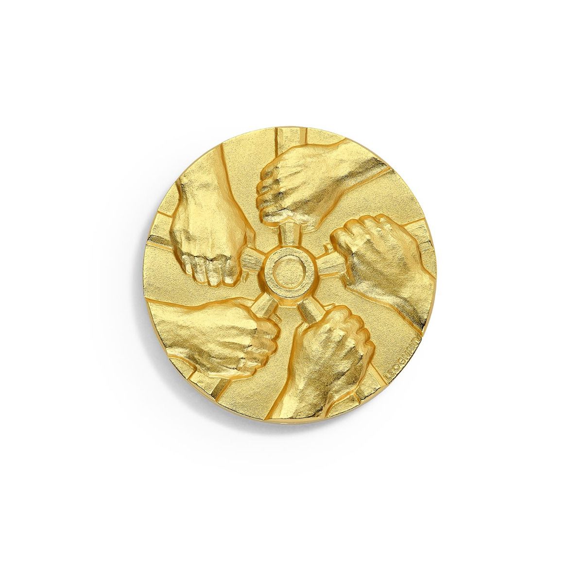Cette médaille de forme ronde est en bronze doré. Sur la pièce de la médaille se trouve cinq mains en plein effort. Le diamètre est de 5,7 centimètres.