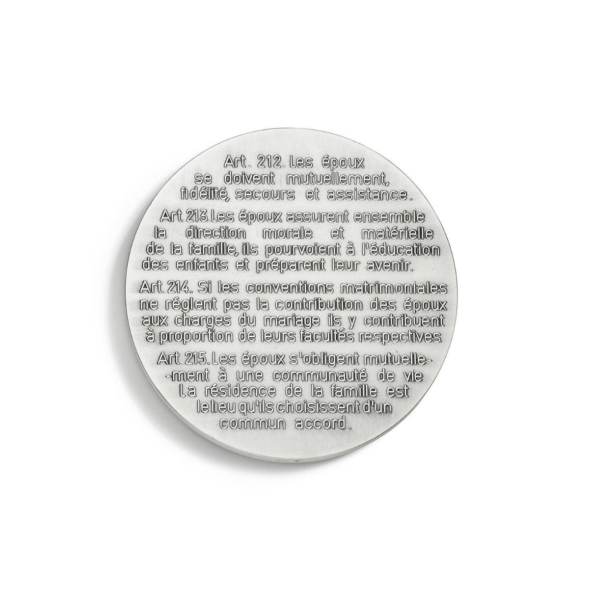 Au revers, on retrouve les articles de loi lus pendant la cérémonie de mariage.