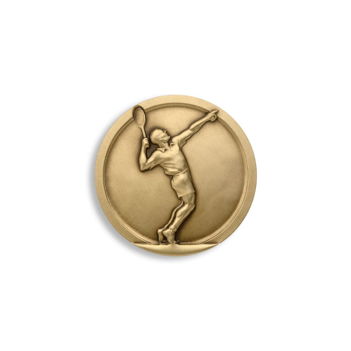 Découvrez notre médaille Tennis Homme, une pièce d'exception de 50 mm fabriquée dans notre atelier français. Estampée en bronze patiné, elle représente un tennisman exécutant un service.