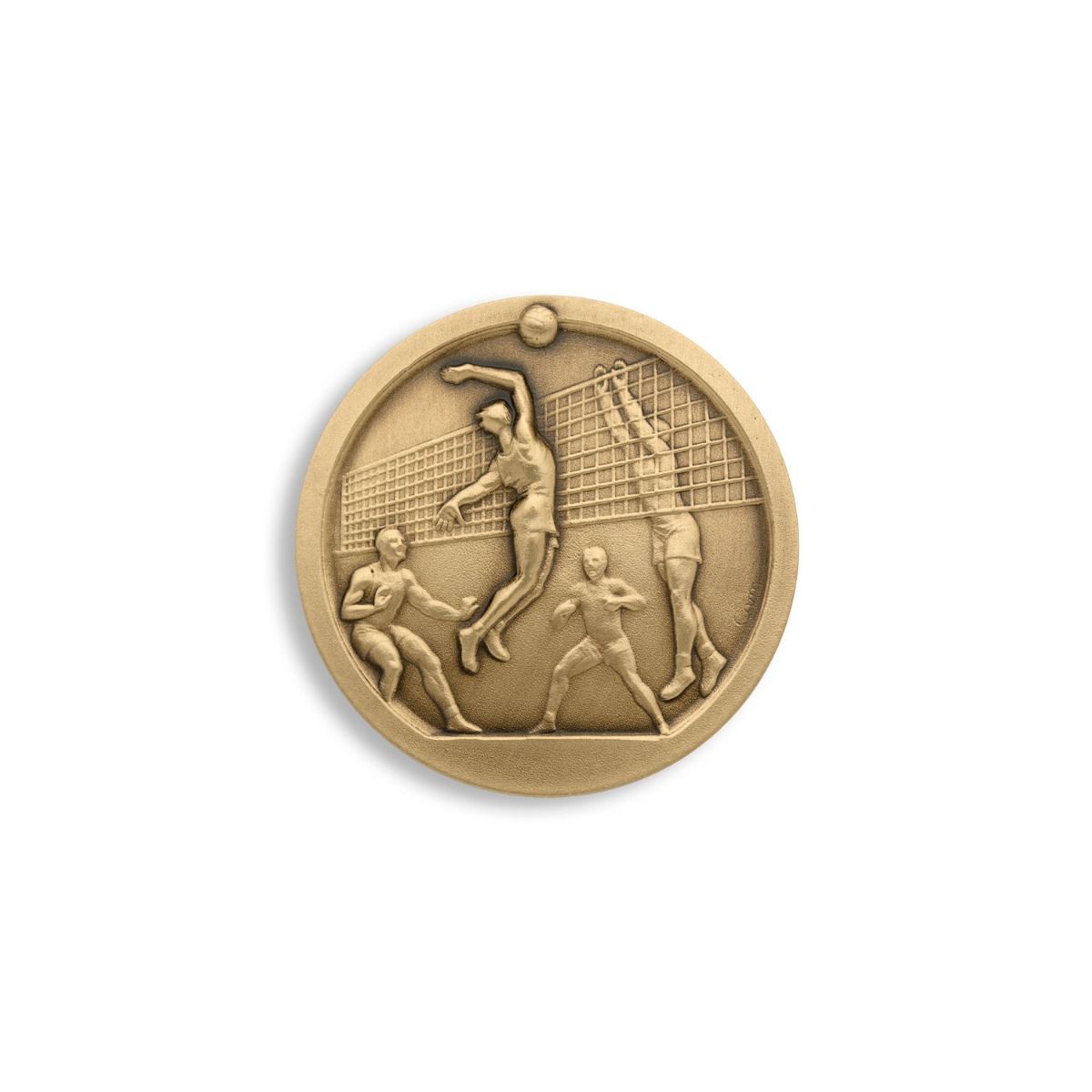 Estampée en bronze patiné avec un diamètre de 46mm, cette pièce fige en relief un volleyeur en train de smasher.