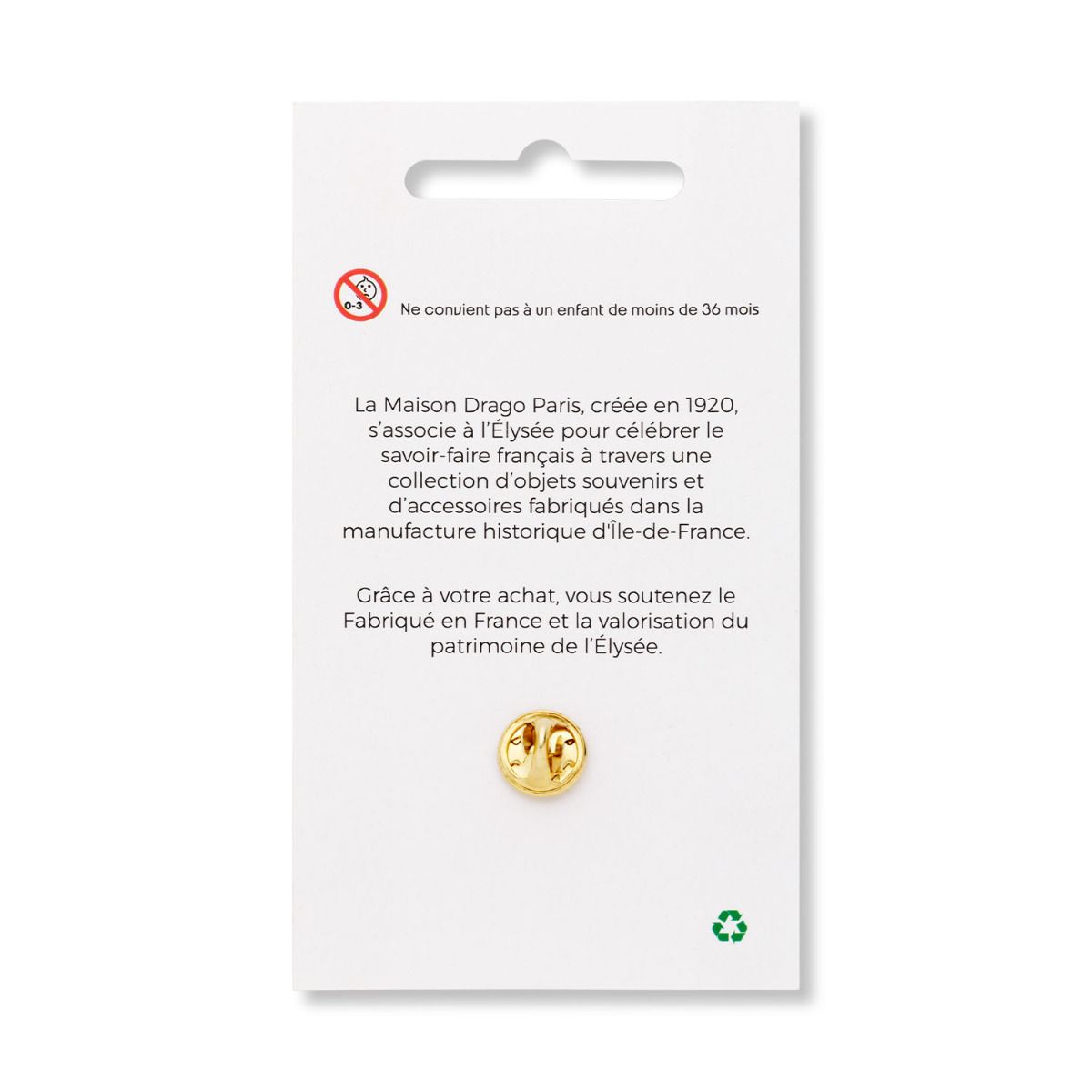 Fabriqué dans notre atelier français, ce pin's doré est doté d'une impression du Palais de l'Élysée ainsi que de l'inscription "Présidence de la République" en exergue.