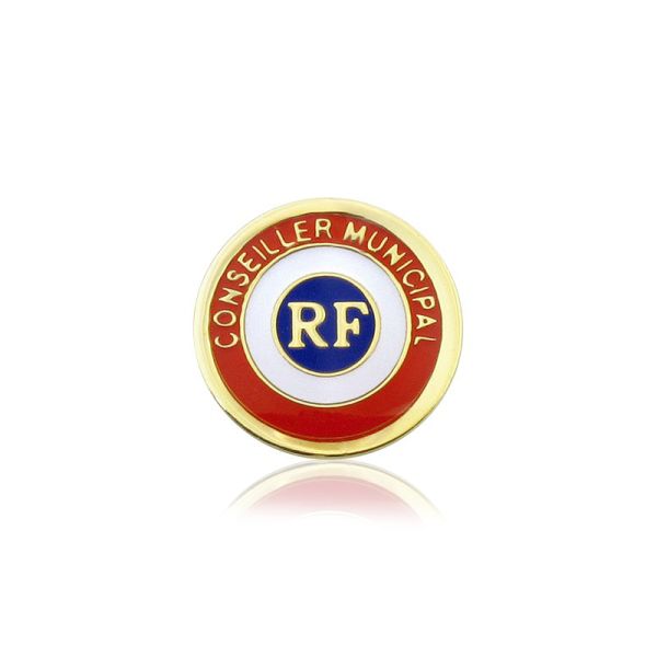 Cette broche à la finition argentée est destinée aux Conseillers Municipaux. Celle-ci est agrémentée d'un coq argenté, symbole de la République Française, et de l'inscription "RF" au centre sur fond bleu. Sa hauteur est de 35 millimètres et sa largeur est de 20 millimètres.