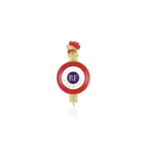 Cet insigne boutonnière en métal doré est destiné au Maire-Adjoint. Celui-ci est composé d'une cocarde tricolore émaillée et recouverte de résine. Sur la cocarde se trouvent les mentions "RF" et "Maire-Adjoint" en métal doré. Le diamètre est de 15 millimètres et la fixation est de type pin's.
