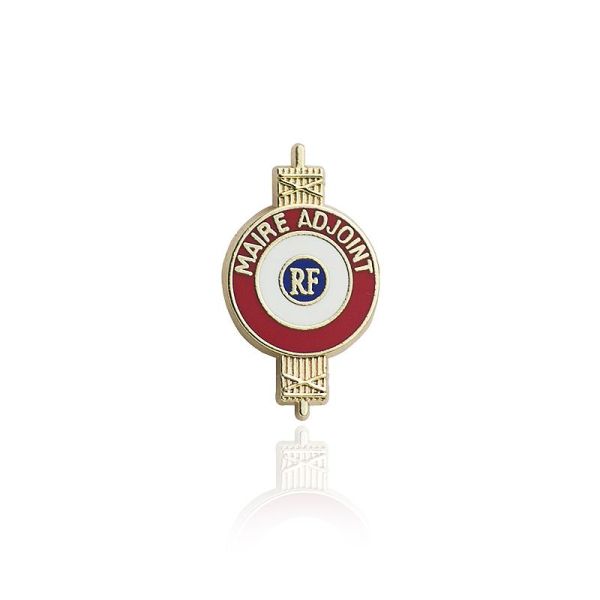 Cet insigne en métal doré est destiné au Maire-Adjoint. Celui-ci est composé d'une cocarde tricolore émaillée et recouverte de résine. Sur la cocarde se trouvent les mentions "RF" et "Adjoint" en métal doré. Cette dernière est entourée d'une couronne de chêne et laurier en métal doré. Le diamètre est de 18 millimètres et la fixation est de type pin's.