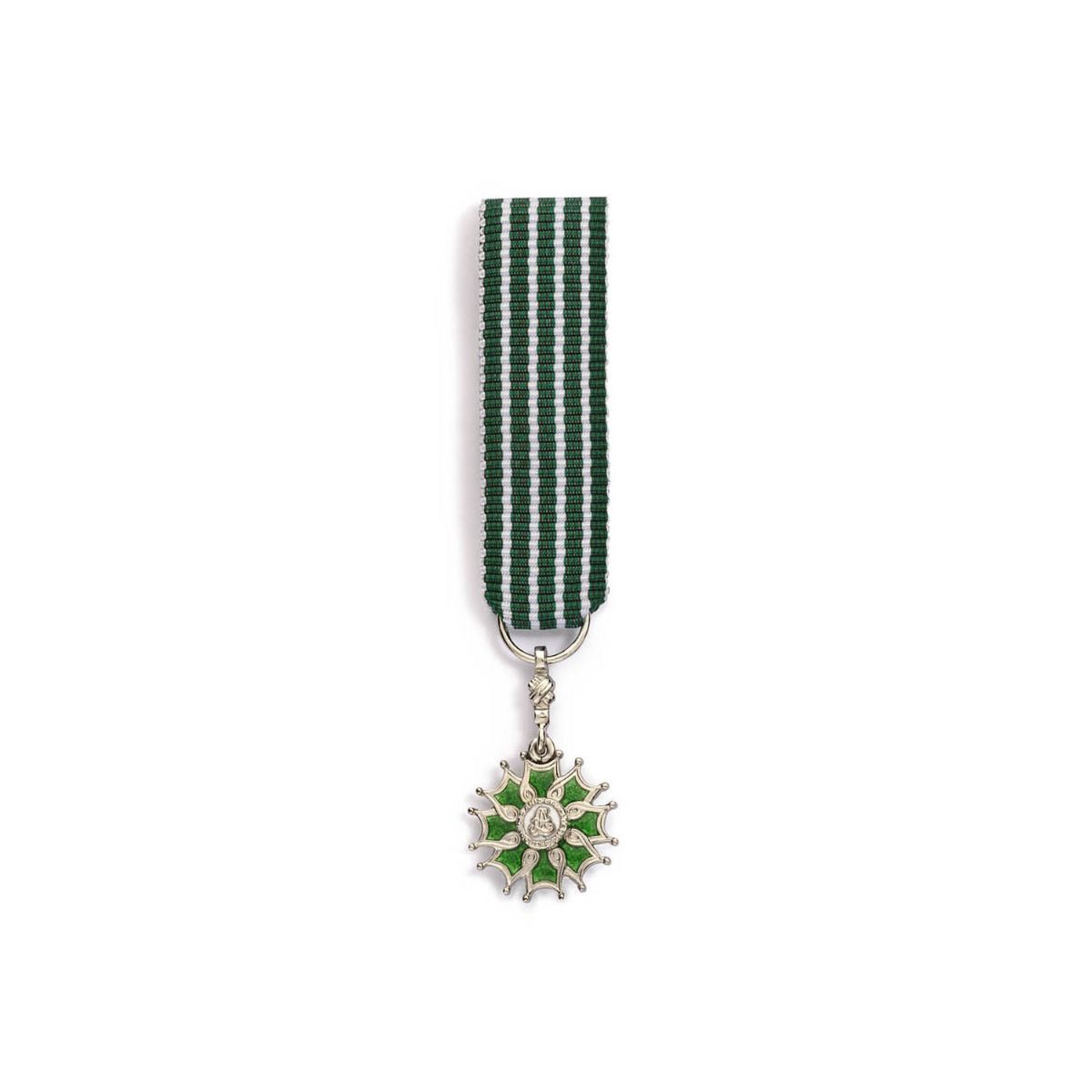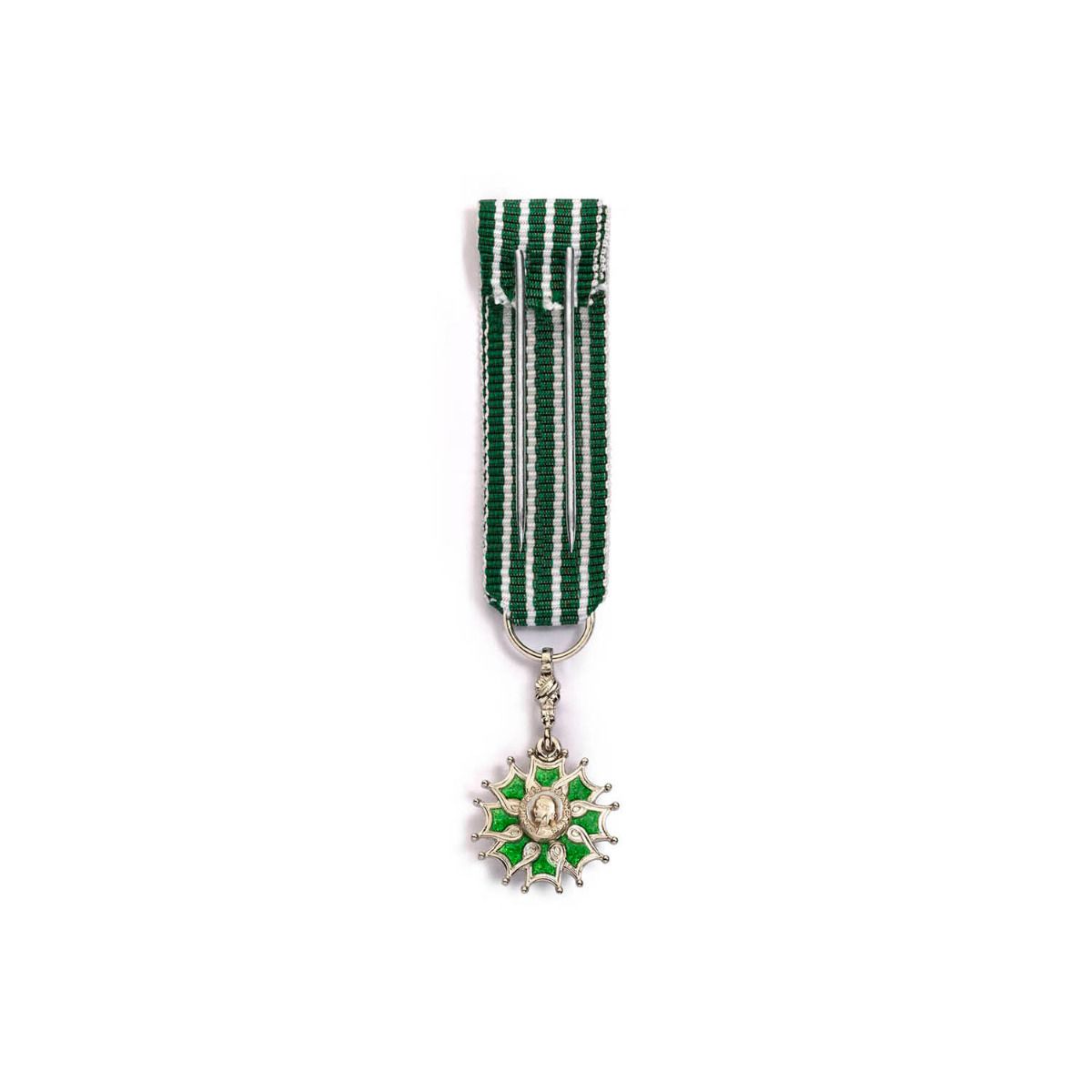 La miniature est constituée d'une croix double face à huit branches émaillée de vert et sertie d'une arabesque argentée. L'insigne est composé d'un monogramme représentant des lettres A et L entrelacées qui est entouré d'un listel portant l'inscription "République Française". Au revers de l'insigne, se trouve une effigie de la République entourée d'un listel portant l'inscription "Ordre des Arts et des Lettres". Le ruban est composé de cinq bandes de couleur vert foncé séparées par quatre bandes verticales blanches. Celui-ci a une longueur de 4 centimètre et une largeur de 15 millimètres. Le diamètre de l'insigne est de 15 millimètres. Le poids d'argent moyen est de 2,30 grammes.