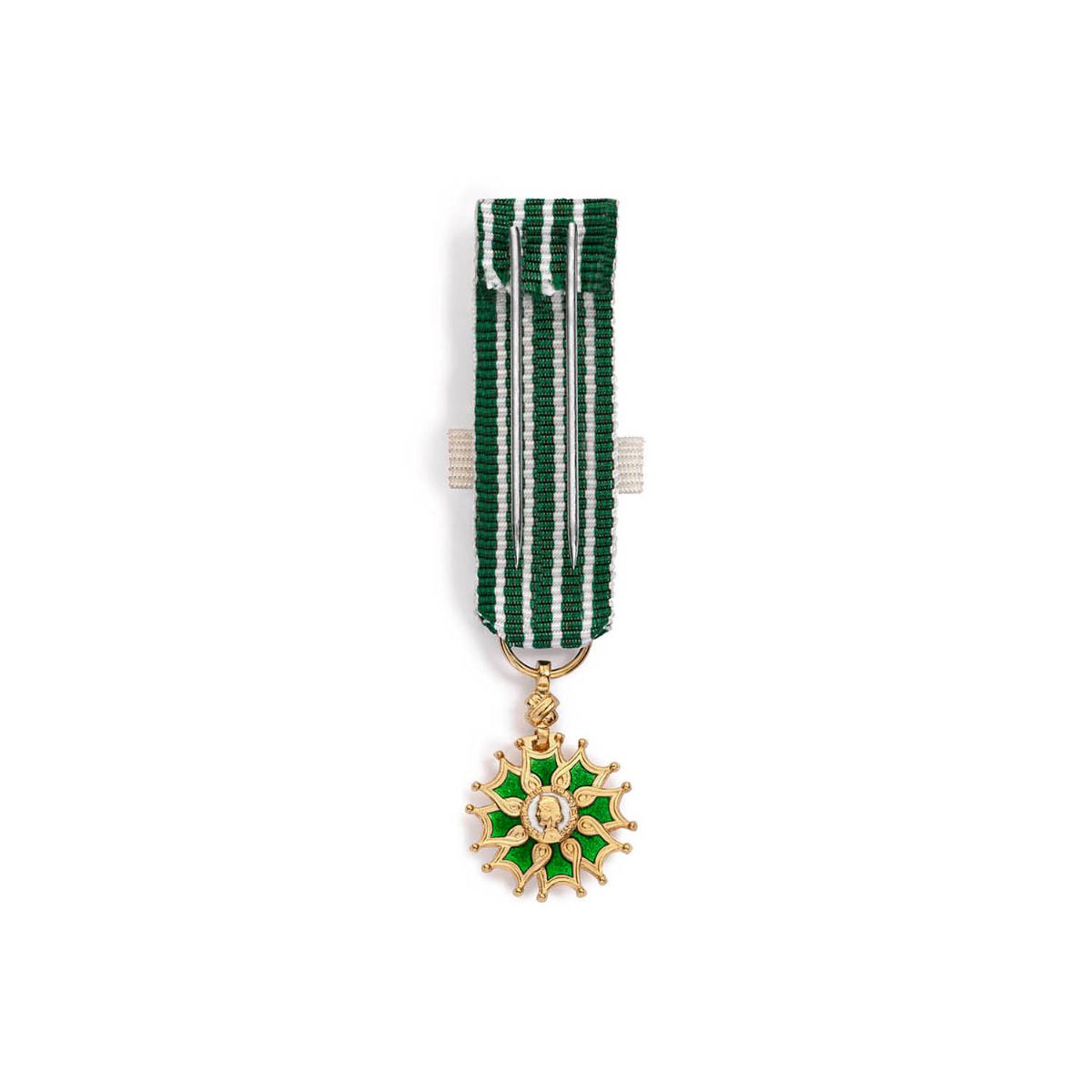 La miniature en argent doré est constituée d'une croix double face à huit branches émaillée de vert et sertie d'une arabesque dorée. L'insigne est composé d'un monogramme représentant des lettres A et L entrelacées qui est entouré d'un listel portant l'inscription "République Française". Au revers de l'insigne, se trouve une effigie de la République entourée d'un listel portant l'inscription "Ordre des Arts et des Lettres". Le ruban est composé de cinq bandes de couleur vert foncé séparées par quatre bandes verticales blanches. Le ruban a une longueur de 4 centimètres et une largeur de 15 millimètres. Une rosette de couleur verte et blanche y est fixée au centre. Le diamètre de l'insigne est de 15 millimètres. Le poids d'argent moyen est de 2,30 grammes.