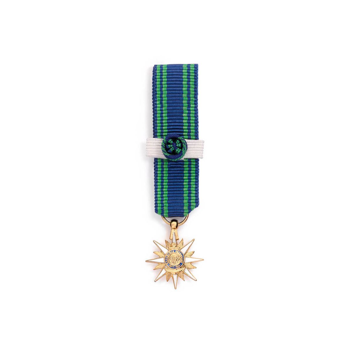 La miniature en argent doré est composée d'une étoile double face en forme de rose des vents à seize branches. Les huit branches principales sont émaillées de blanc. Sur l'avers du médaillon central est représentée l'effigie de la république. Cette dernière est entourée de l'inscription "République Française" sur un fond d'émail bleu. Au revers de la médaille se trouve l'inscription "Mérite Maritime" entourée par la mention "Marine Marchande" sur fond d'émail bleu. La miniature est suspendue à un ruban moiré constitué d'une bande de couleur bleue et de deux bandes vertes séparés par un liseré bleu. Celui-ci a une longueur de 40 millimètres et une largeur de 15 millimètres. Une rosette bleue et verte est fixée sur un galon blanc au centre du ruban. Le diamètre de la médaille est de 15 millimètres.