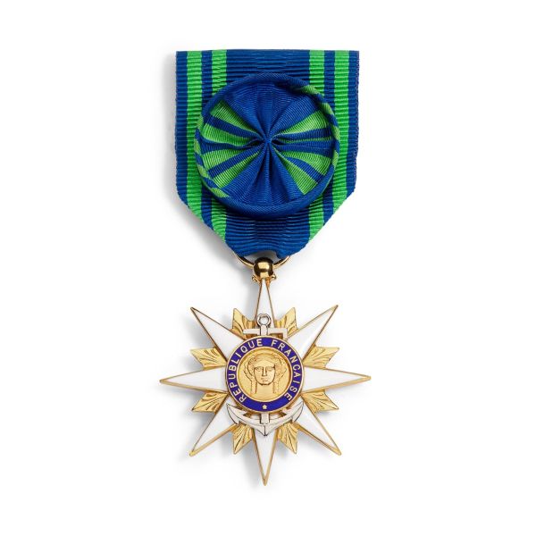 La miniature en argent doré est composée d'une étoile double face en forme de rose des vents à seize branches. Les huit branches principales sont émaillées de blanc. Sur l'avers du médaillon central est représentée l'effigie de la République. Cette dernière est entourée de l'inscription "République Française" sur un fond d'émail bleu. Au revers de la médaille se trouve l'inscription "Mérite Maritime" entourée par la mention "Marine Marchande" sur fond d'émail bleu. La miniature est suspendue à un ruban moiré constitué d'une bande de couleur bleue et de deux bandes vertes séparées par un liseré bleu. Celui-ci a une longueur de 40 millimètres et une largeur de 15 millimètres. Une rosette bleue et verte est fixée sur ce ruban. Le diamètre de la médaille est de 15 millimètres. Le poids d'argent moyen est de 2 grammes.