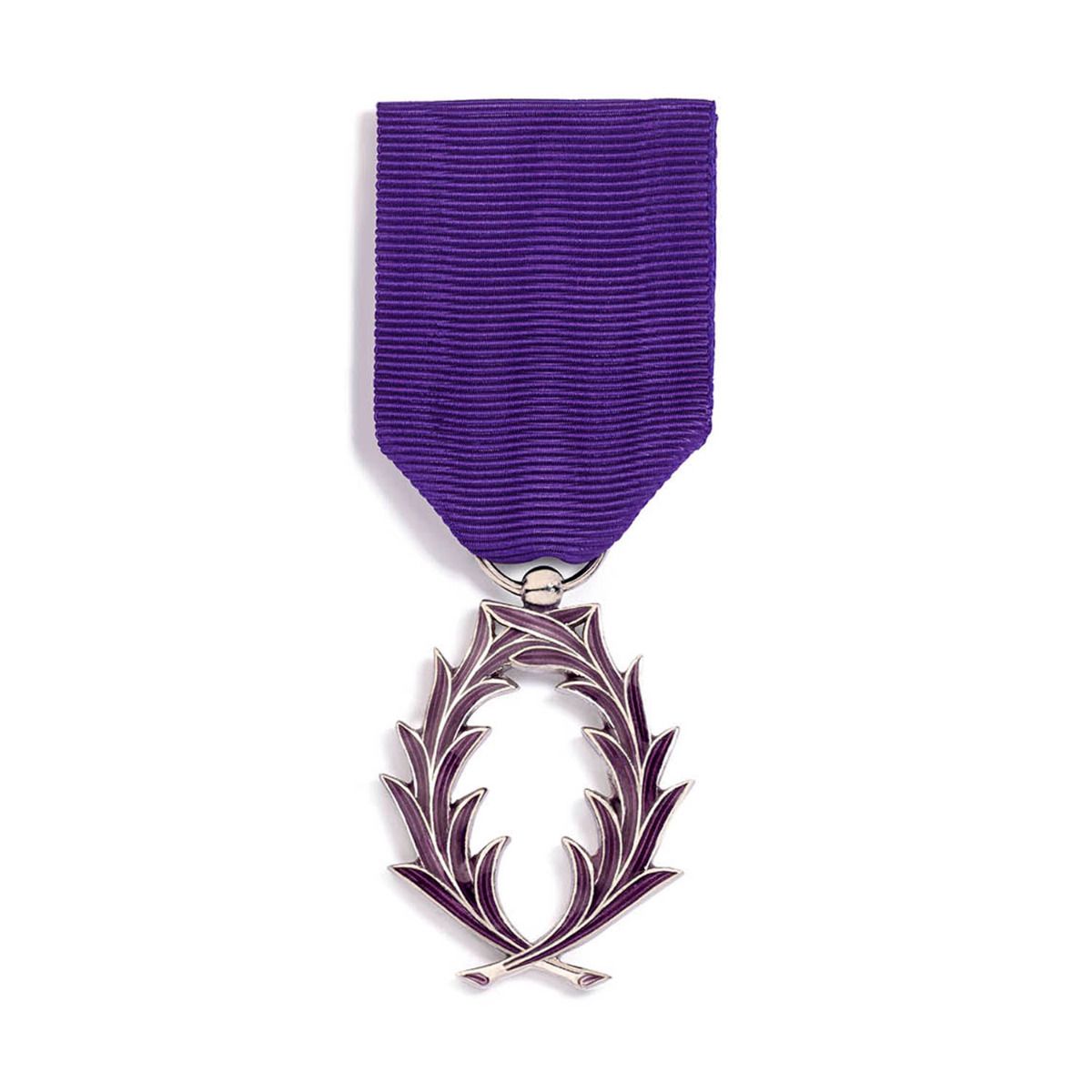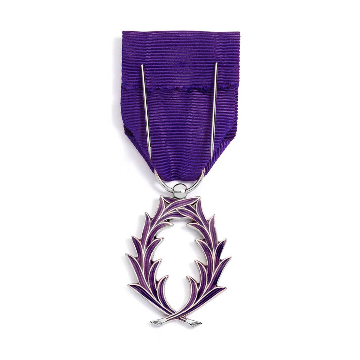 Cette médaille en argent est constituée d'une double palme en argent émaillée de violet. Elle est suspendue à un ruban moiré violet d'une longueur de 60 millimètres et d'une largeur de 34 millimètres. La hauteur de l'insigne est de 40 millimètres. Le poids d'argent moyen est de 10 grammes.