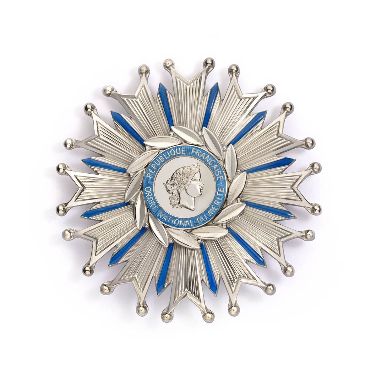 Cette plaque en argent massif est composée d'une étoile à douze branches doubles émaillées de bleu. Les branches sont boutonnées dans les extrémités. Au centre du médaillon se trouve l'effigie de Marianne entourée de l'inscription "République Française - Ordre National du Mérite" sur fond d'émail bleu. Une couronne de feuilles de laurier en argent encercle ce médaillon. Le diamètre de l'insigne est de 90 millimètres. La plaque se porte sur le côté droit de la poitrine.