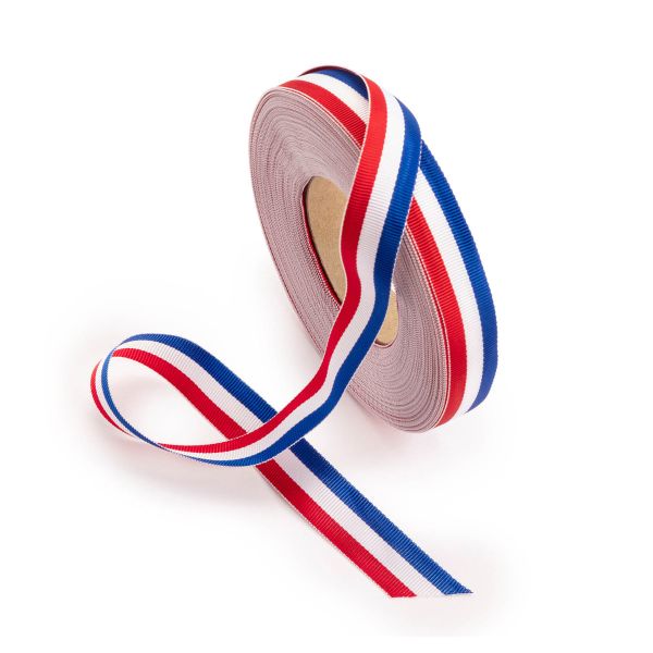 Ce ruban en tissu est de couleur bleu, blanc et rouge. Le ruban a unelargeur de 7 millimètres. La bobine est vendue uniquement par lot de 25 mètres.